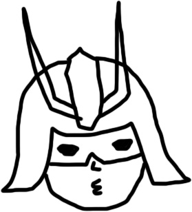 上記のセリフを言いそうな同行者の一例(手探りで作画).赤っぽい服着て目立つし,ツノ付きヘルメットも着けてるから,野外調査の安全対策はバッチリ!
